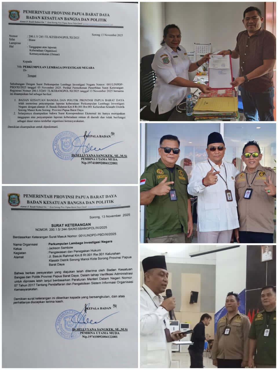 “Kami berterima kasih kepada Kesbangpol Papua Barat Daya yang telah memberikan Surat Keterangan untuk DPD Lembaga Investigasi Negara. Ini menjadi bukti bahwa negara hadir mendukung peran lembaga dalam menjaga akuntabilitas, keterbukaan, dan pengawasan di daerah,” ujar Jackson dalam pernyataannya.