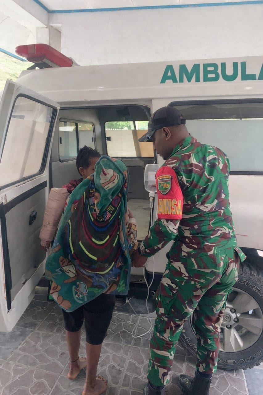 Mulia – Babinsa Koramil 1714-01/Mulia mendampingi tim medis RSUD Mulia dalam proses evakuasi korban insiden yang terjadi pada 14 April 2026 di Kampung Kembru, Distrik Sinak, Kabupaten Puncak Jaya.