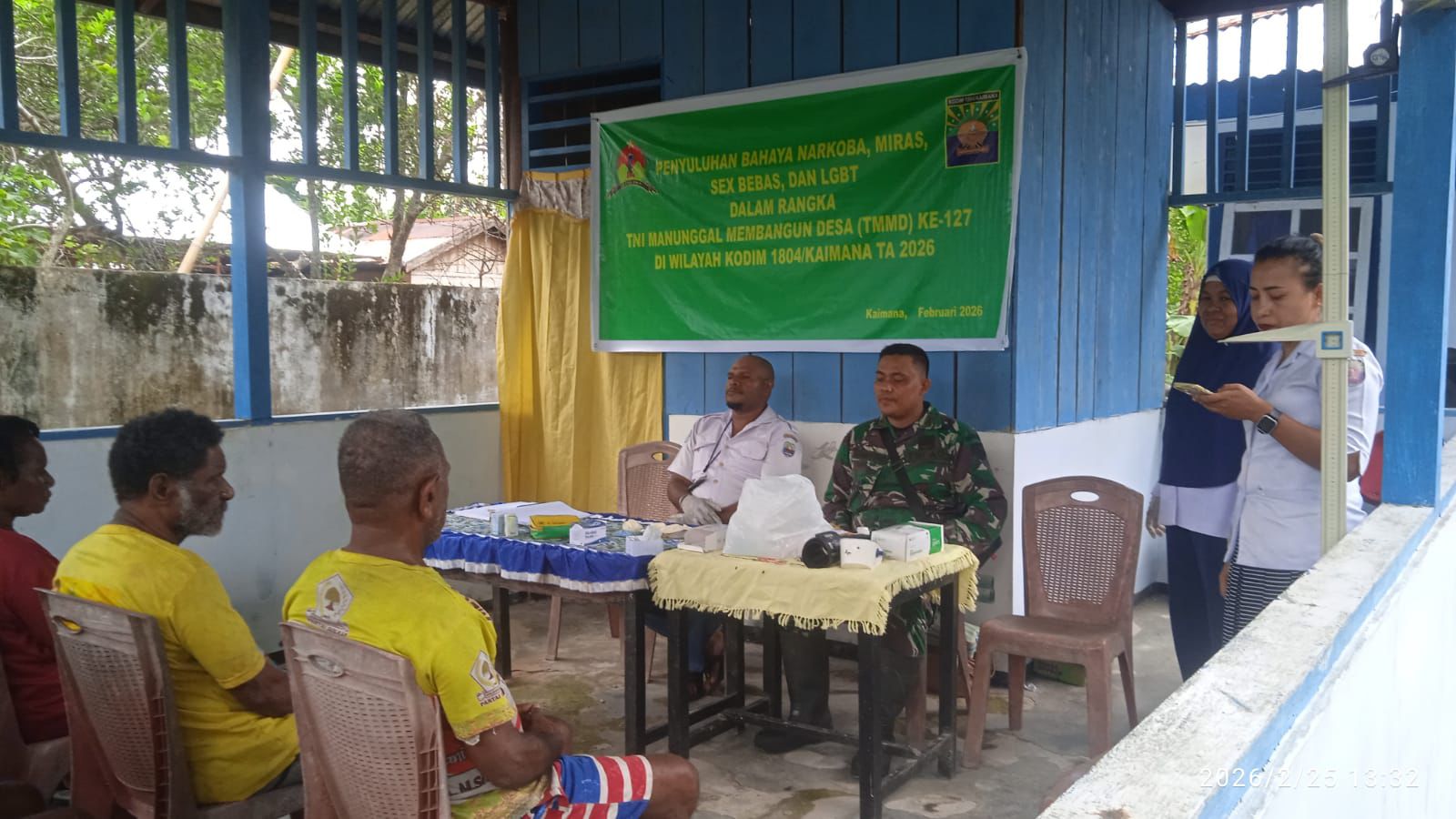 Kaimana, (26 Februari 2026) – Dalam rangkaian kegiatan TNI Manunggal Membangun Desa (TMMD) ke-127, Kodim 1804/Kaimana melaksanakan sasaran non fisik berupa sosialisasi dan penyuluhan tentang bahaya narkoba, minuman keras (miras), seks bebas dan LGBT di Kampung Sisir, Distrik Kaimana, Kabupaten Kaimana, Kamis (26/02/2026).