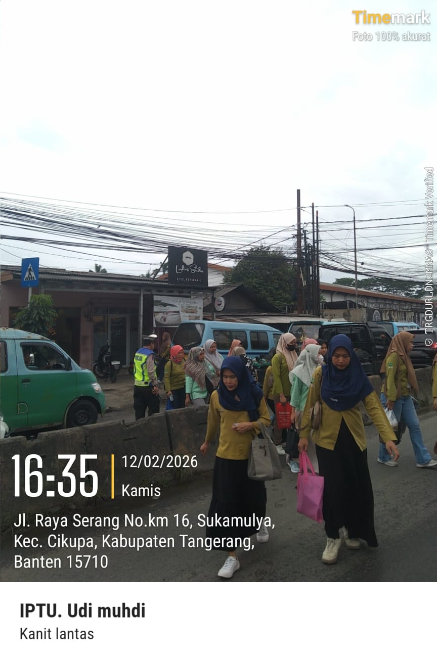 Cikupa — Personel Lantas Polsek Cikupa Polresta Tangerang melaksanakan kegiatan PECAK berupa pengaturan arus lalu lintas pada Kamis (12/2/2026) di Jalan Raya Serang, Pertigaan Columbus PT Cingluh, wilayah hukum Polsek Cikupa.