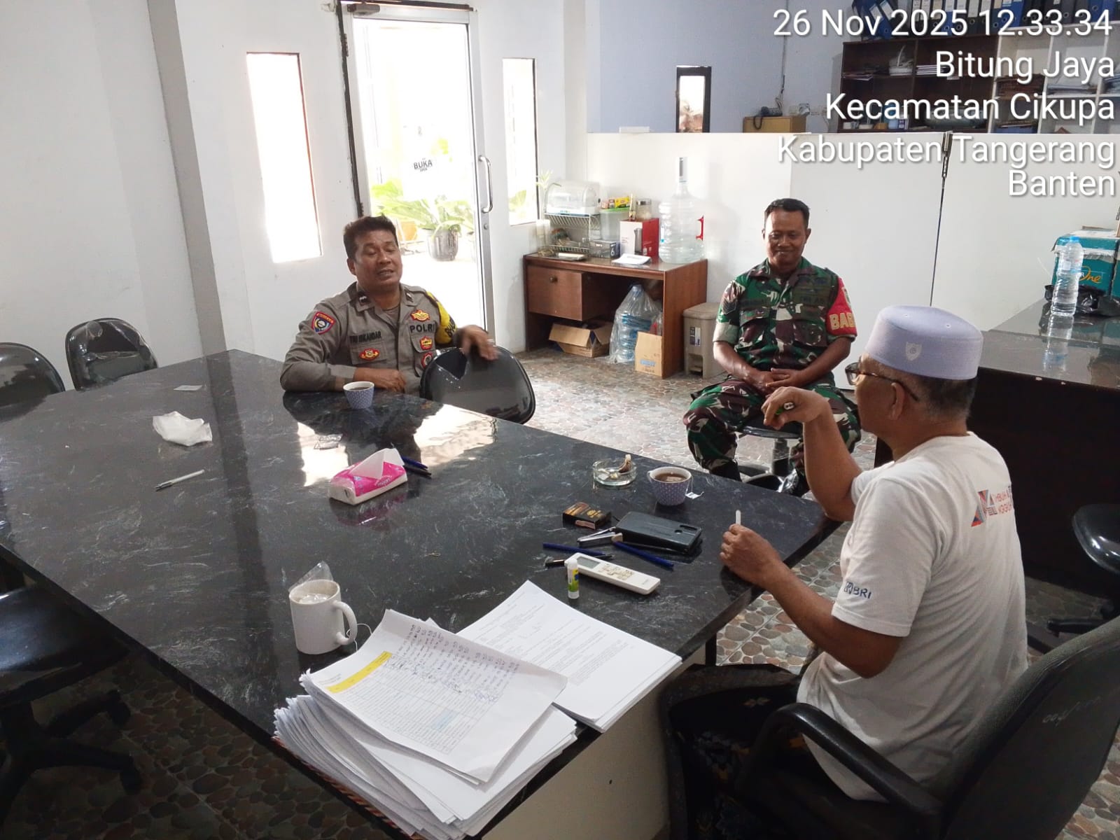 Cikupa — Personel Polsek Cikupa bersama Babinsa melaksanakan kegiatan sambang ke tokoh masyarakat di Kampung Bulakan, RT 10/04, Desa Bitung Jaya, Kecamatan Cikupa, Kabupaten Tangerang, pada Rabu (26/11/2025) sekitar pukul 12.30 WIB.