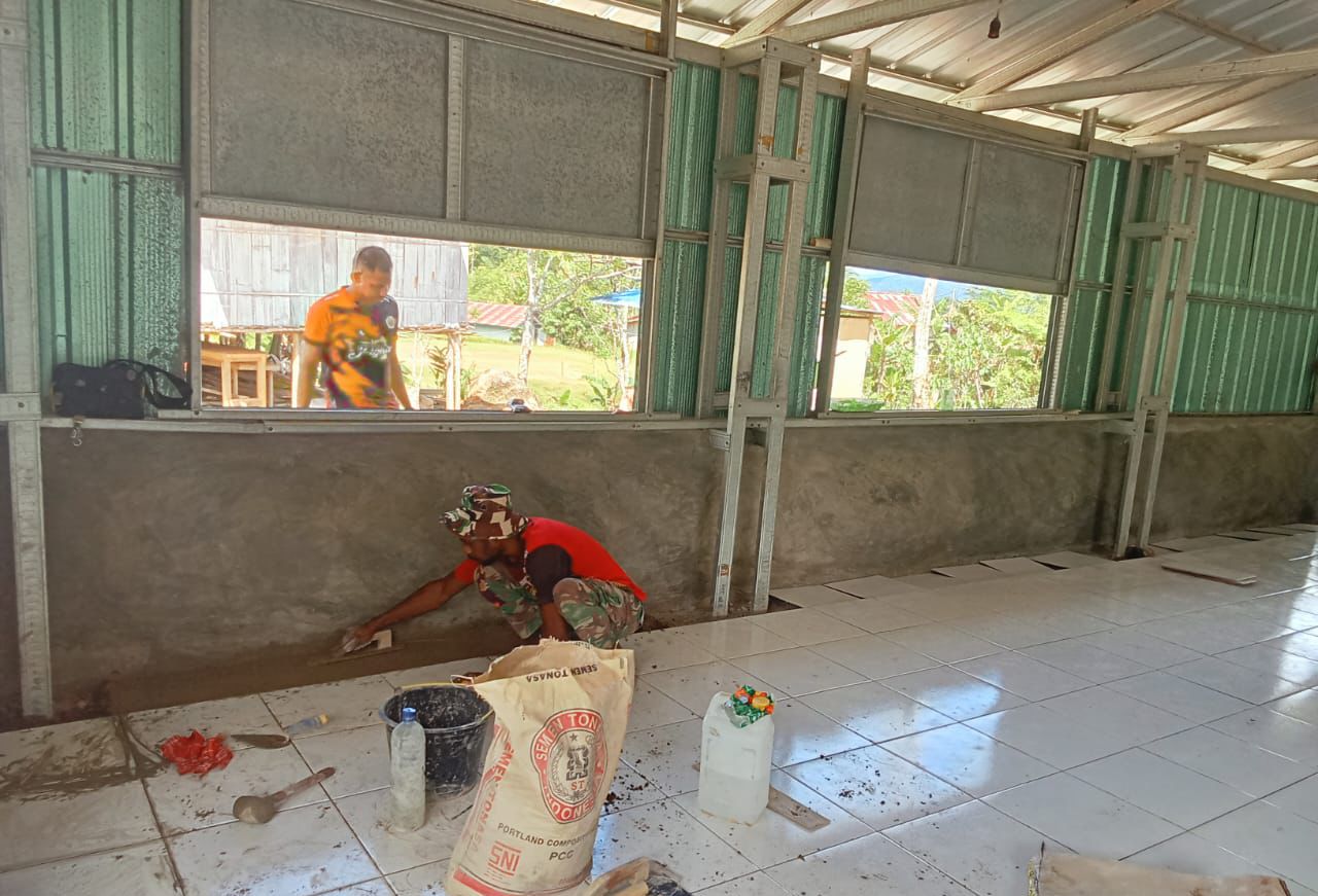 Suasana kerja di lokasi terlihat penuh semangat. Prajurit TNI dan masyarakat bahu-membahu menuntaskan setiap detail pekerjaan, mulai dari pemasangan keramik lantai hingga pengecatan bagian luar dan dalam gereja. Kerjasama yang terjalin erat ini menjadi bukti nyata kemanunggalan TNI dengan rakyat di lapangan.