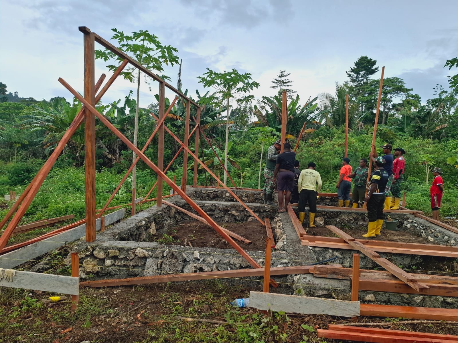 Manokwari Utara — Pelaksanaan program TNI Manunggal Membangun Desa (TMMD) Ke-128 oleh Kodim 1801/Manokwari terus menunjukkan perkembangan yang menggembirakan. Memasuki hari ketiga kegiatan, pembangunan empat unit Rumah Layak Huni (RLH) di Kampung Tanah Rubuh, Distrik Manokwari Utara, Kabupaten Manokwari, telah memasuki tahap penting dengan berdirinya struktur tiang utama.