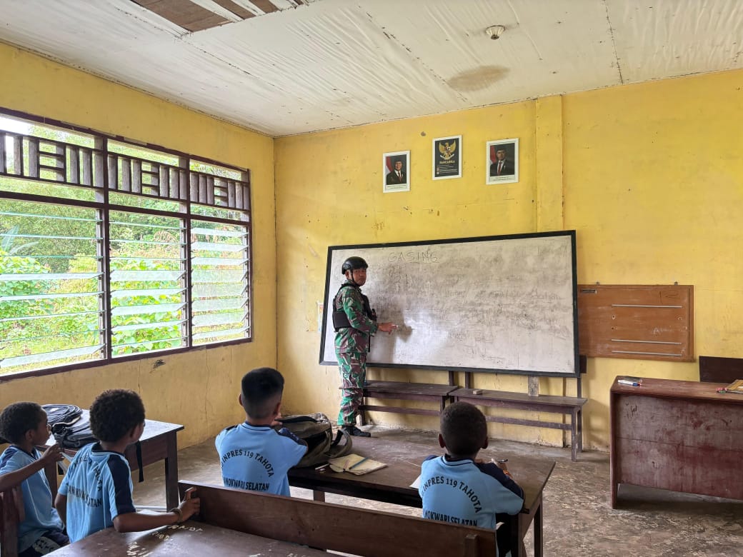 PAPUA BARAT.JEJAKPERISTIWA – Minimnya tenaga guru di Distrik Tahota, Papua Barat, personel Satgas Yonif 410/Alugoro Pos Kout membantu sebagai tenaga pendidik di SD Inpres 119 Tahota. Sabtu (24/8/2025).